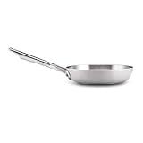 8-inch stainless steel skillet great for making an omelet for one.Suitable for use on all cooktops, including glass and induction.Interior safe for use with metal utensils; cast stainless steel handle.Constructed of aluminum with a professional clad stainless steel interior for fast, even heating.Safe to use under the broiler; dishwasher safe; limited lifetime warranty. Designed for those who demand professional performance and relish everyday convenience, Anolon Chef Clad stainless steel cookware offers minimum fuss for a lifetime of cooking pleasure. This 8-inch open skillet is great for making an omelet for one or just sauteing garlic and mushrooms for topping the perfect pair of steaks. Analon Chef Clad cookware offers an even-heating aluminum base that's fully encapsulated in magnetic stainless steel to maximize heat conductivity. A brushed finish aluminum exterior brings an understated elegance to the home chef and offers the perfect weight and performance. Preferred by professional chefs, the professional, non-reactive clad stainless steel interior is safe for use with metal utensils. A cast stainless steel handle is dual riveted for maximum stability and long-term durability, and it fits comfortably in your hand as well as features a hole for hanging. Suitable for use on all cooktops, including glass and induction. Safe to use under the broiler. Dishwasher safe. Backed by a limited lifetime warranty.
