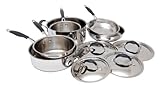 This 10-piece stainless steel cookware set has a stylish look that is functional and durable. Stainless steel is a popular all-around cooking material because it heats quickly and evenly, while the aluminum-capped bases add energy efficiency and excellent heat retention. This cookware doesn't react to acidic foods, resists corrosion and scratches, and cleans easily with just a sponge. High-arching handles covered in comfort grip silicone stay cool on the range and are oven-safe to 350-Degree F. Handles are riveted on for strength, they won't warp, bend, or break no matter how heavy the load or how often used. The saucepans, skillets, and sauté pan each feature a hanging hole on the end of the stylish, flared handle, so you can store and display them on any pot rack. Cookware is safe for gas, electric, and ceramic stove tops, and is safe in the oven up to 350-Degree F. Care instructions: Dishwasher safe, but to preserve the beauty of the cookware, recommend washing with hot soapy water and a sponge. Set includes: 2-Quart sauce pan with lid, 3-Quart sauce pan with lid, 5-Quart Dutch oven with lid, 3-1/2-Quart covered sauté with helper handle and lid, 8-inch fry pan, 9-1/2-inch fry pan.