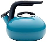 This 2-Quart teakettle features a comfortable, easy-to-grip handle. The kettle features a convenient squeeze and pour handle. The whistle is loud and clear to alert you when water comes to a boil and has a removable lid for easy cleaning and filling.